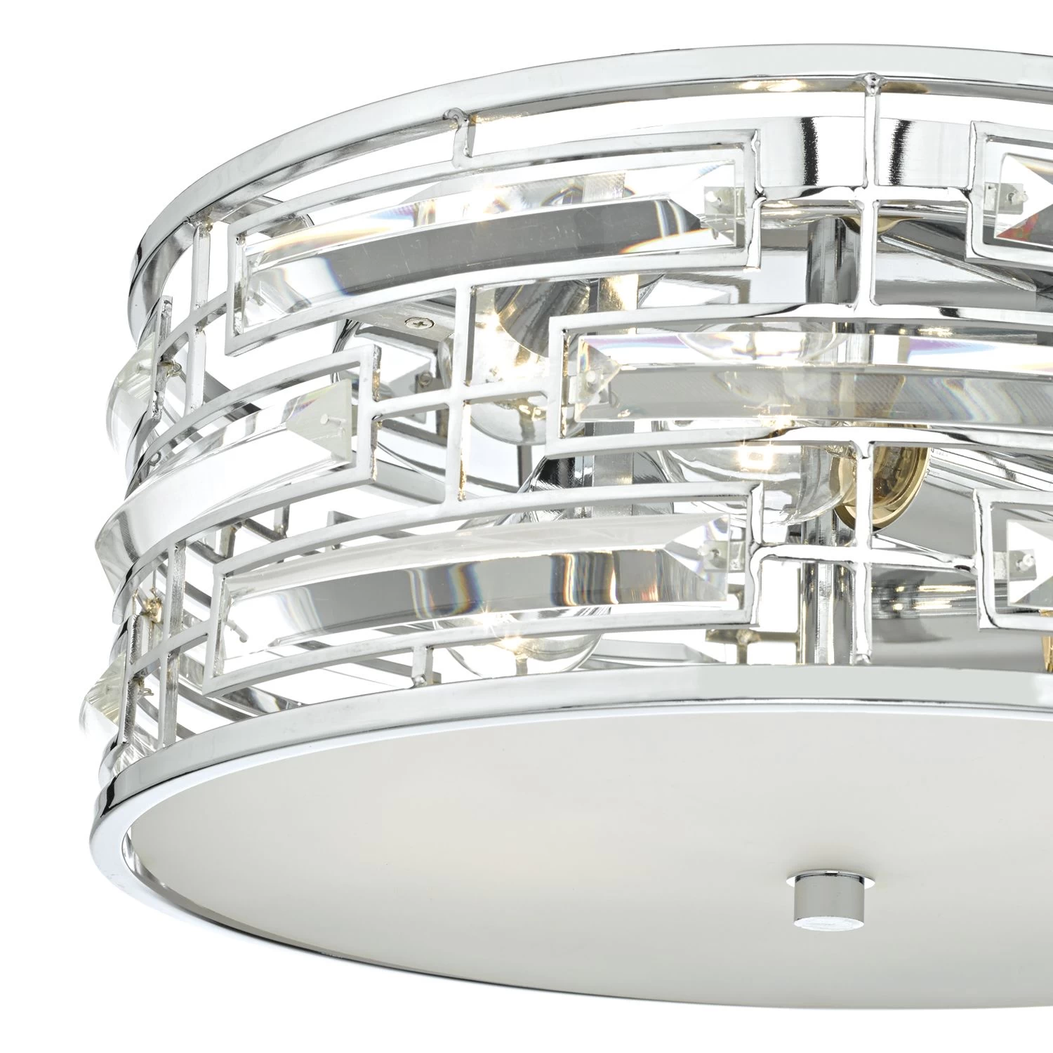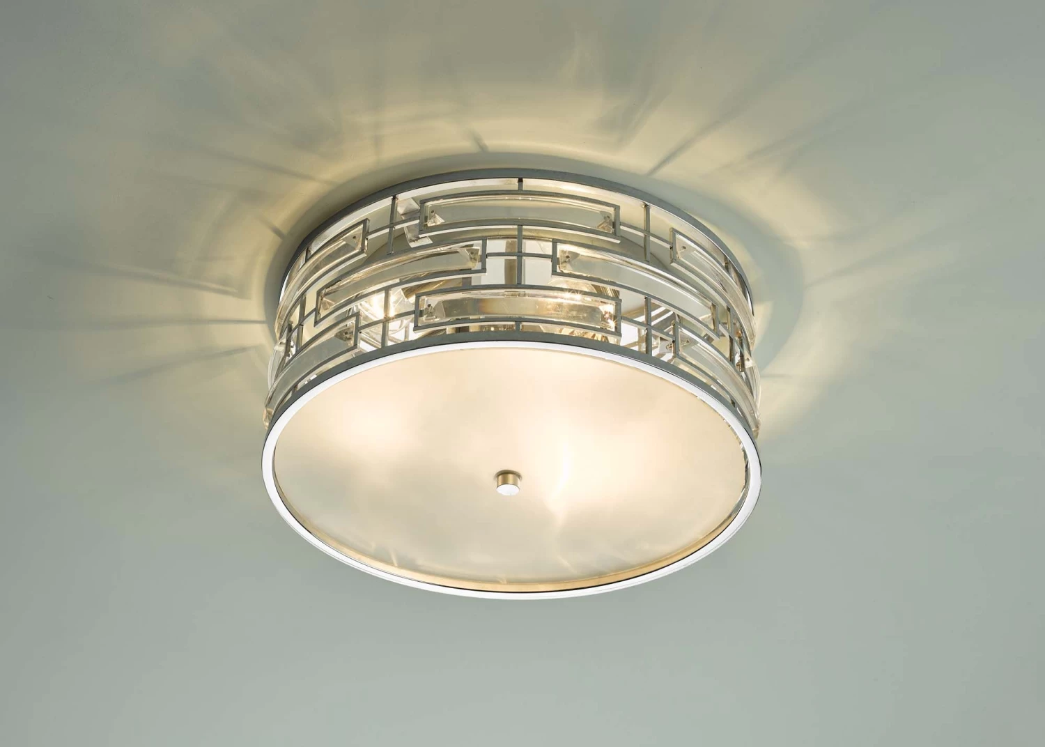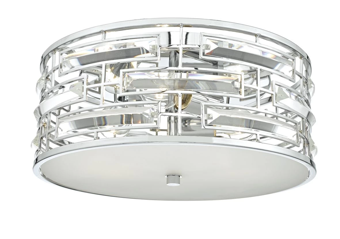 The SEVILLE is a beautiful flush ceiling light made up of delicately curving crystal lozenges, set in a polished chrome frame. With a distinct mid-century feel, it gives out a beautiful sparkling light that is softly diffused from below by a tempered white opal glass diffuser. Suitable for low ceilings.