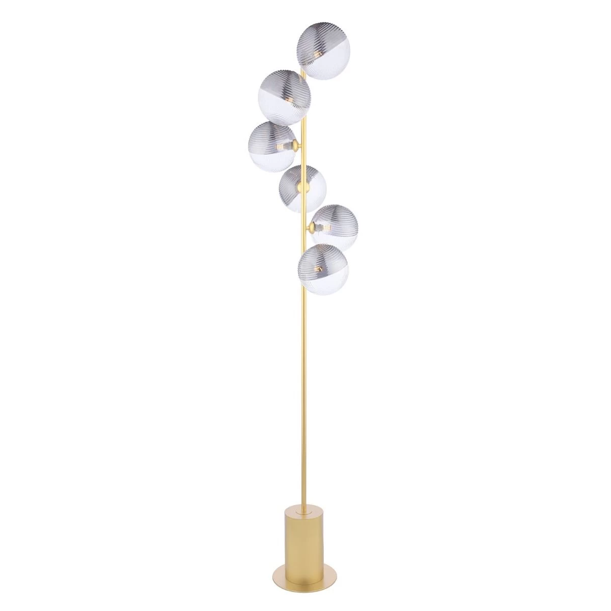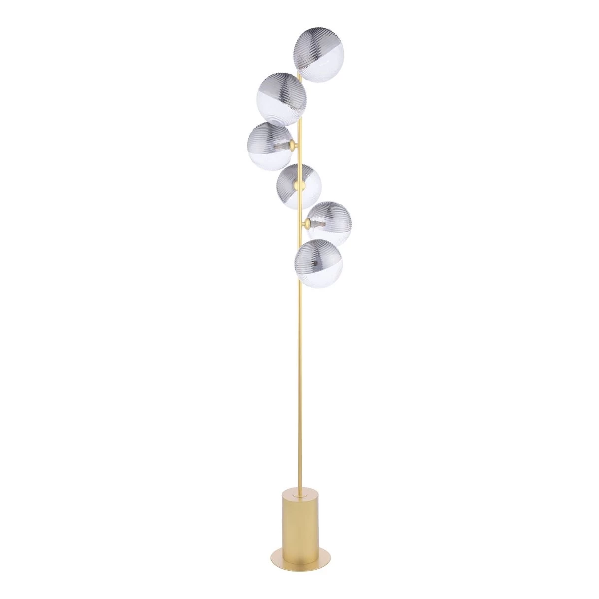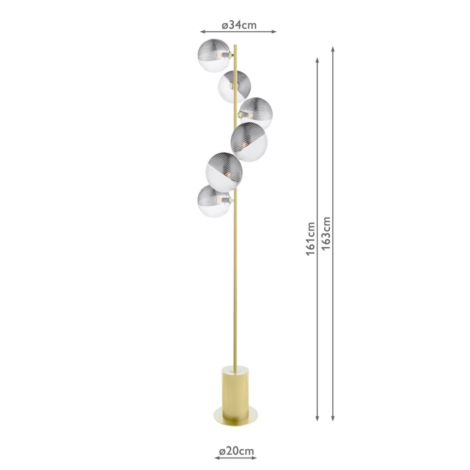 The Spiral 6 Light Matt Gold Floor Lamp with Smoked and Clear Glass is contemporary and stylish with its unique oversized asymmetric glass shades which are half smoked and half clear with opposing radial and linear ribbing. The Spiral floor lamp features a matt gold frame and foot switch for easy operation. Whether used as a reading lamp in the living room or as a statement piece in the bedroom the Spiral floor lamp is sure to impress.