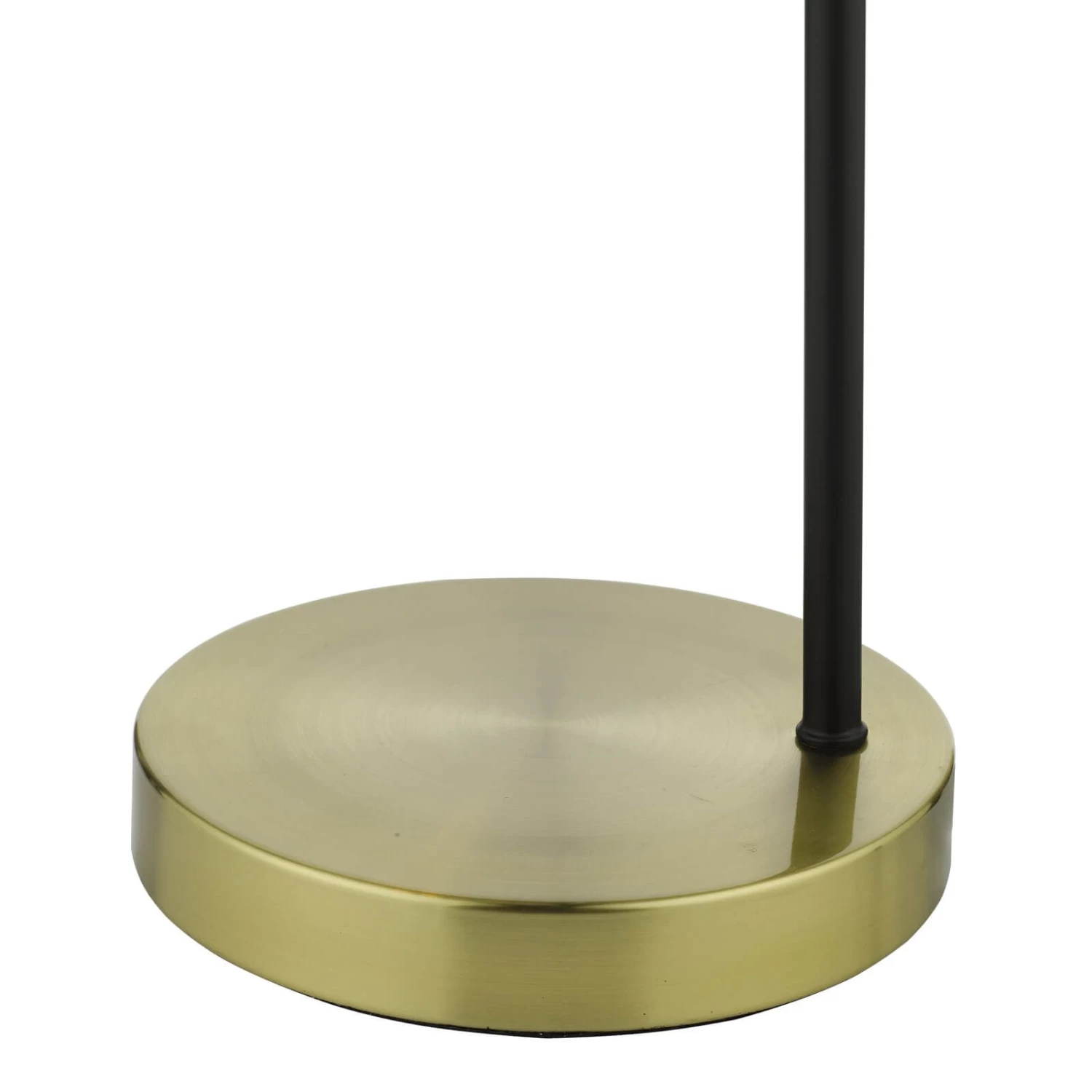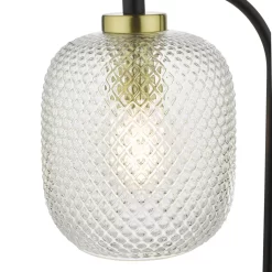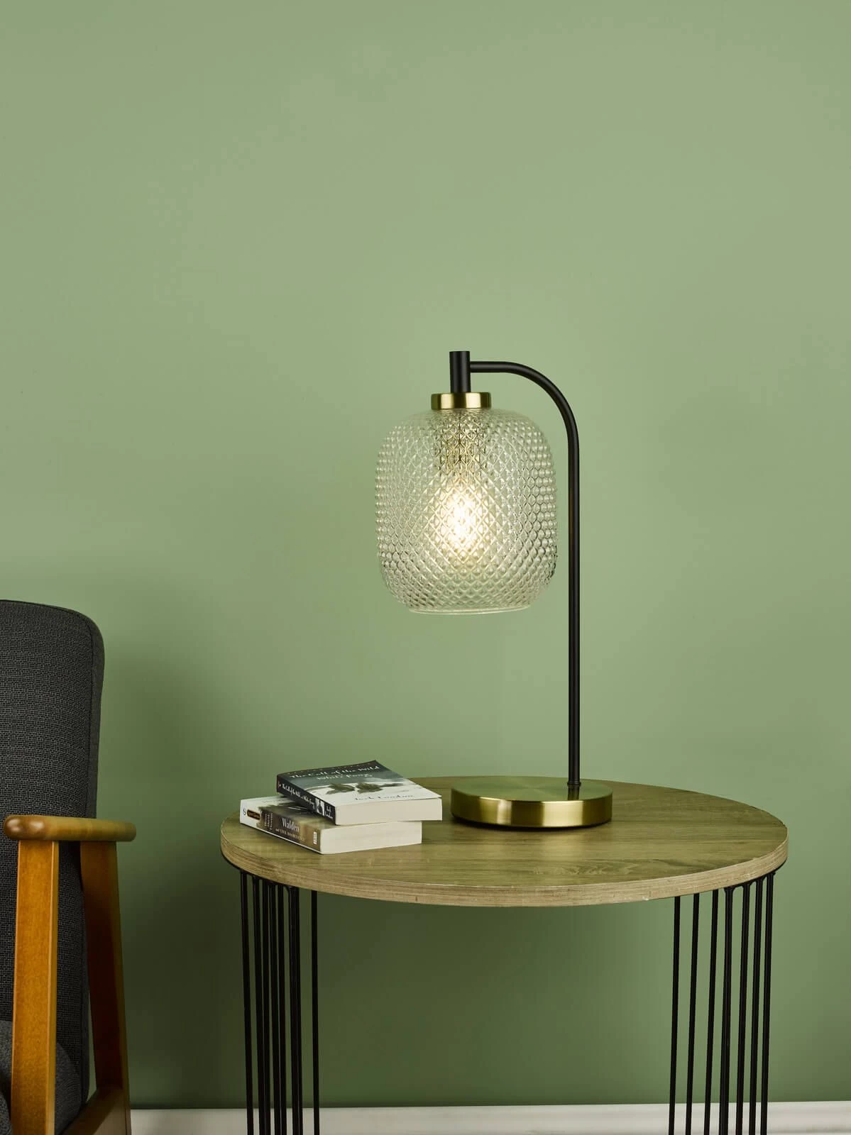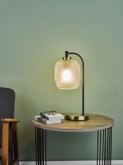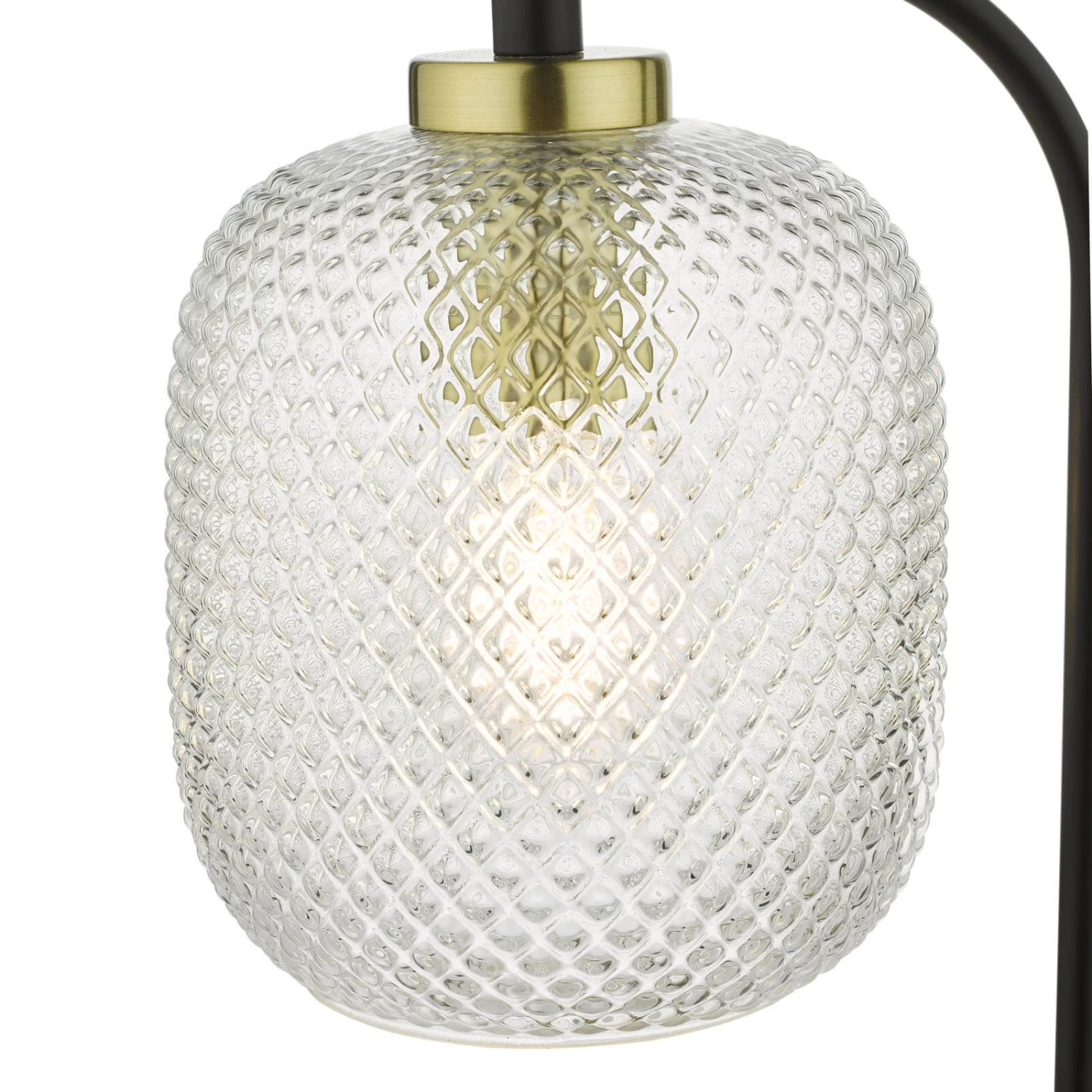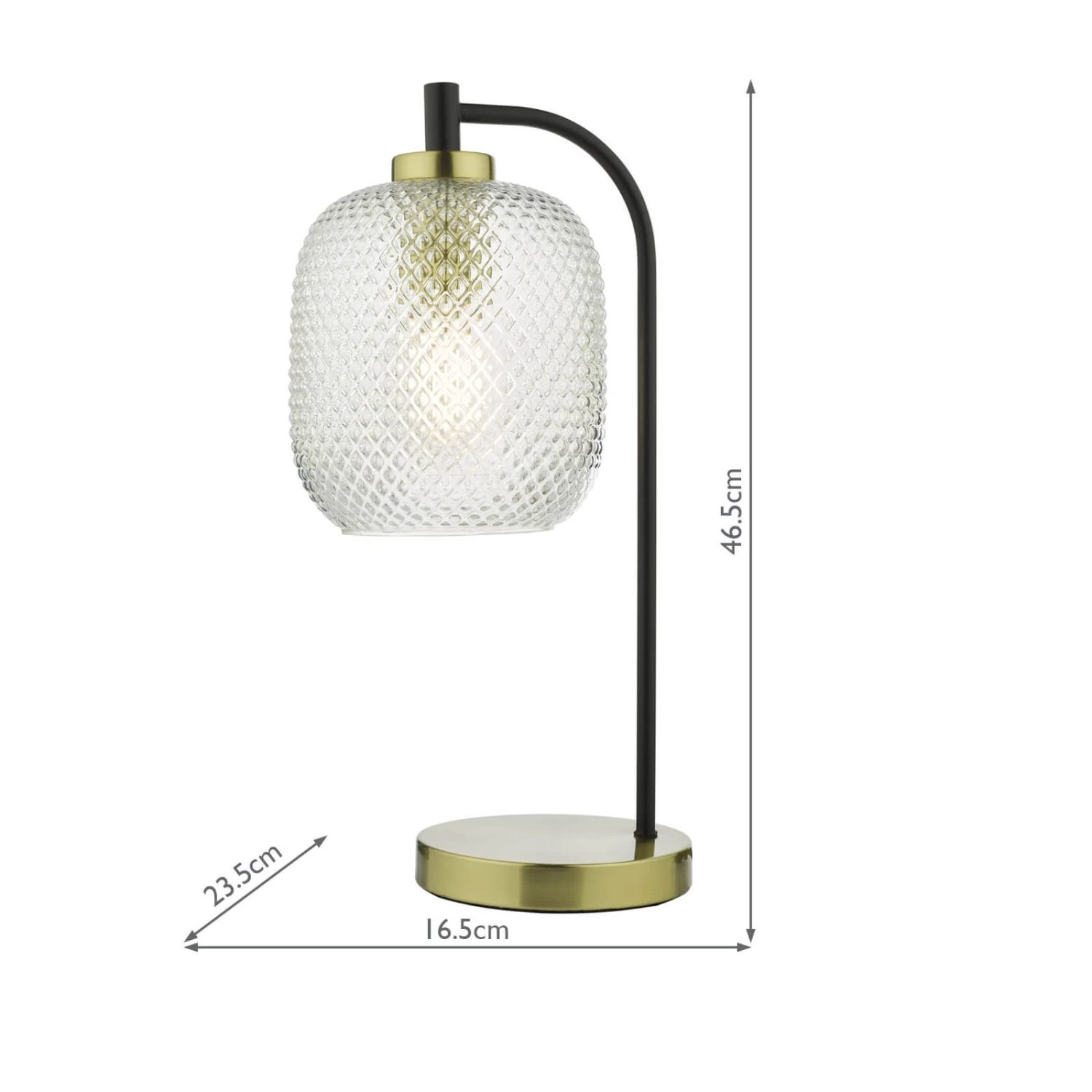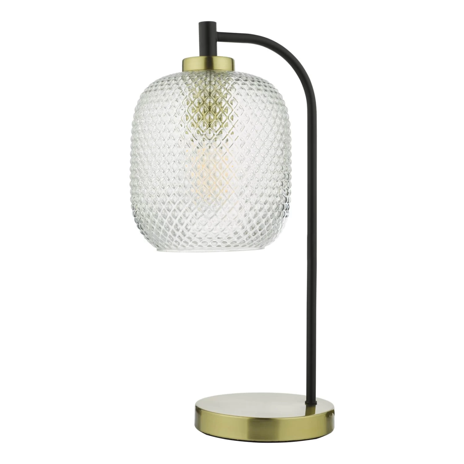 The Tehya table lamp features a clear lozenge-shaped glass shade, which sparkles beautifully, with black metal work and satin brass accents. Perfect as a bedside or desk lamp.