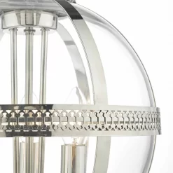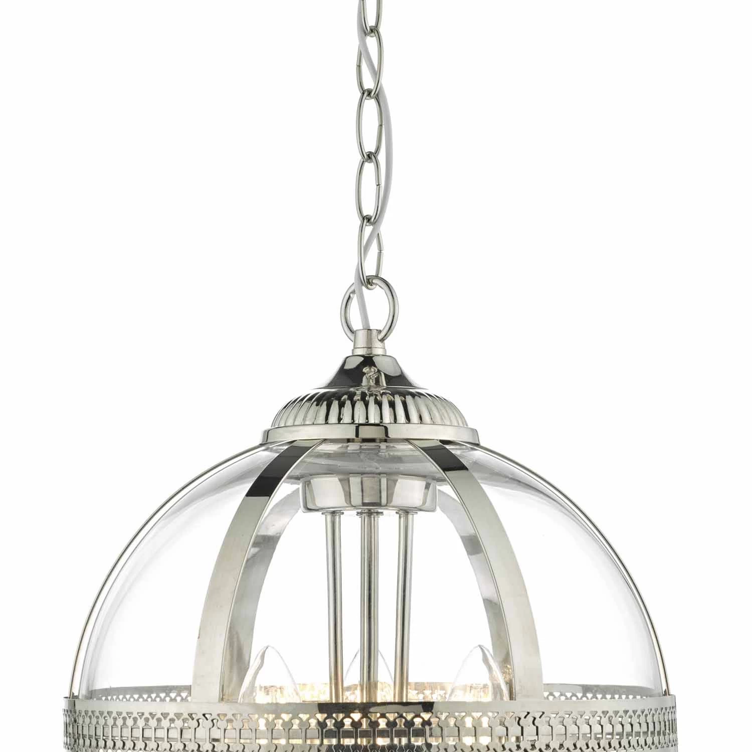 The VANESSA three-light decorative pendant features a spectacular orb glass shade with intricate polished nickel metal work. Suspended by a white braided cable and chain, which is height adjustable at the point of installation.