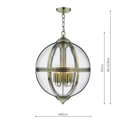 The Vanessa 5 light Lantern VAN0575 in a antique brass finish is decorative pendant featuring a spectacular orb glass shade with intricate metal detailing. This fitting is height adjustable. An eye-catching fitting that would look fabulous in any living space.