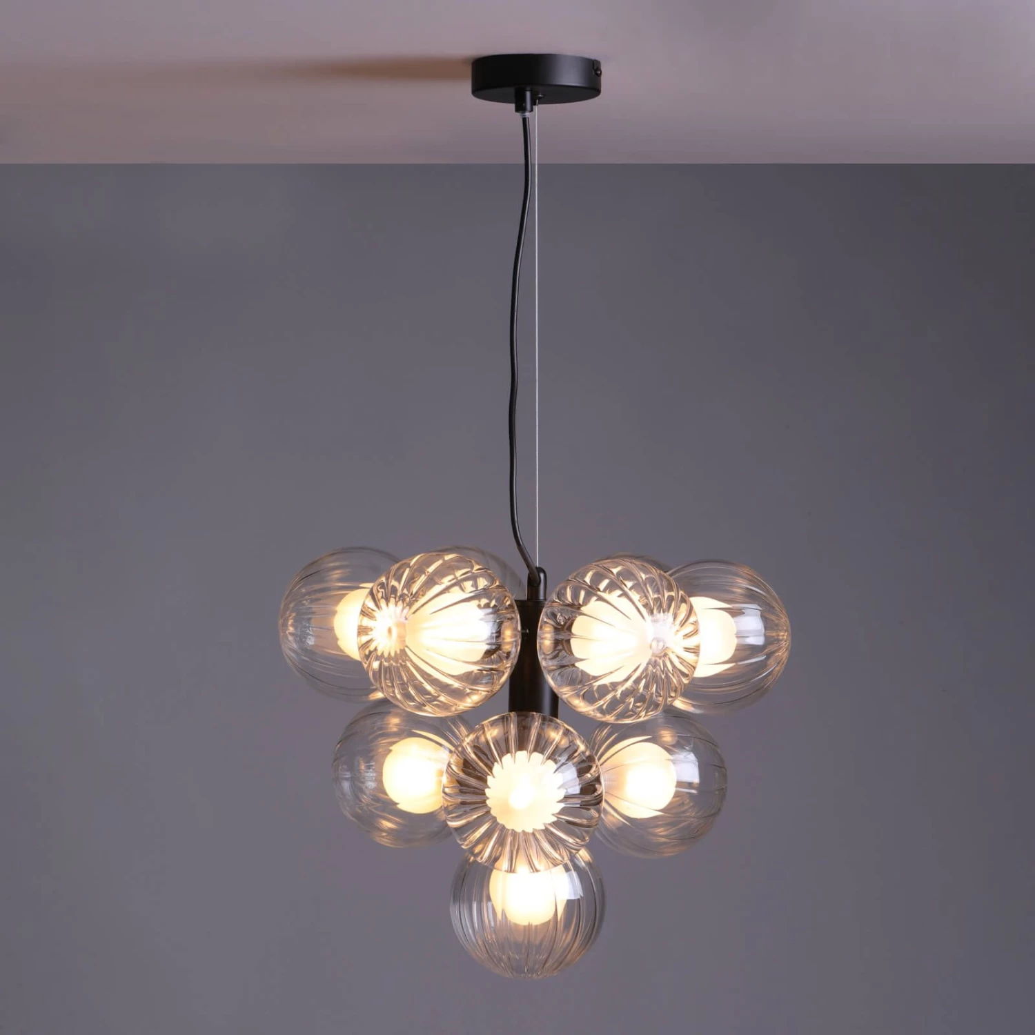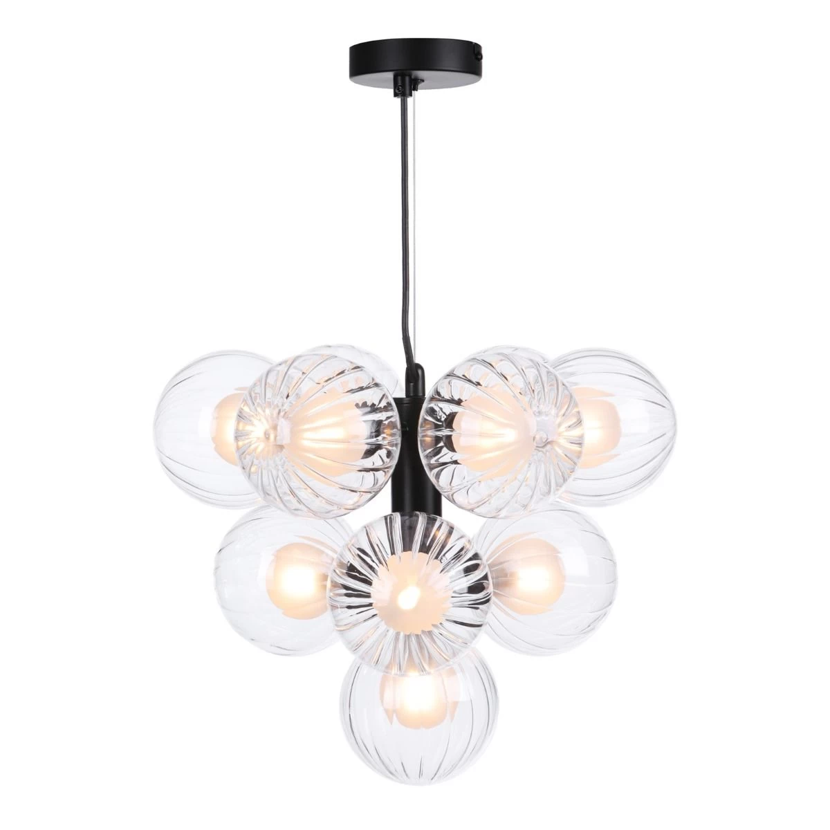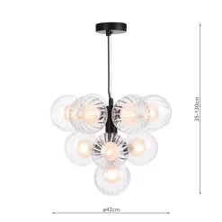 Introducing the Vine 10 Light Pendant Satin Black & Duplex Glass – a masterful interplay of modern design and functional brilliance, ideal for enhancing your living room, dining room, or bedroom. Crafted to perfection, this pendant light boasts duplex glass shades that combine a contemporary ribbed outer surface with an opal non-glare inner, creating a harmonious fusion of style and practicality. The shades provide a balanced diffusion of light, adding a layer of depth and warmth to your interior space. Suspended gracefully by a black braided cable, the Vine pendant captures attention with its sophisticated presence.
