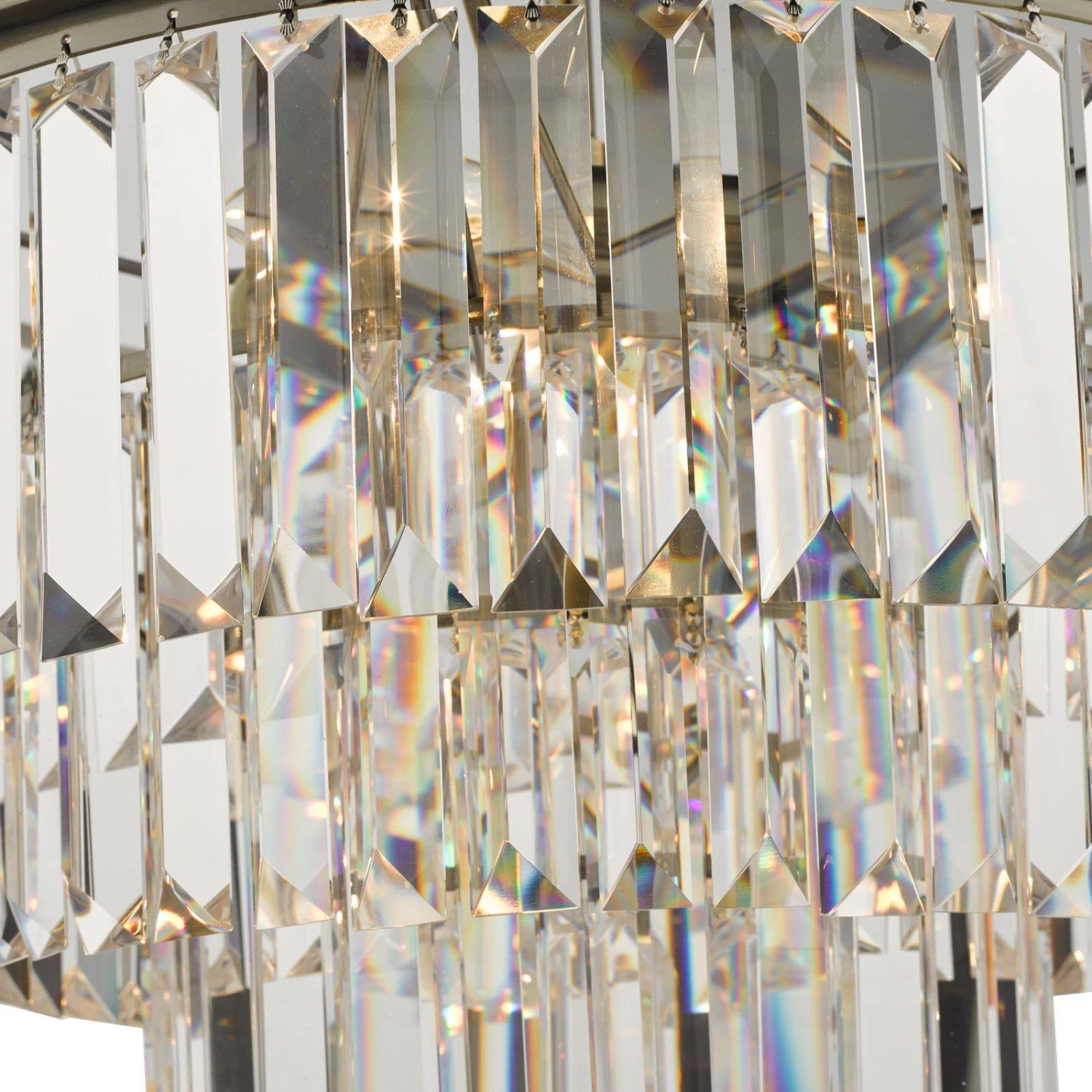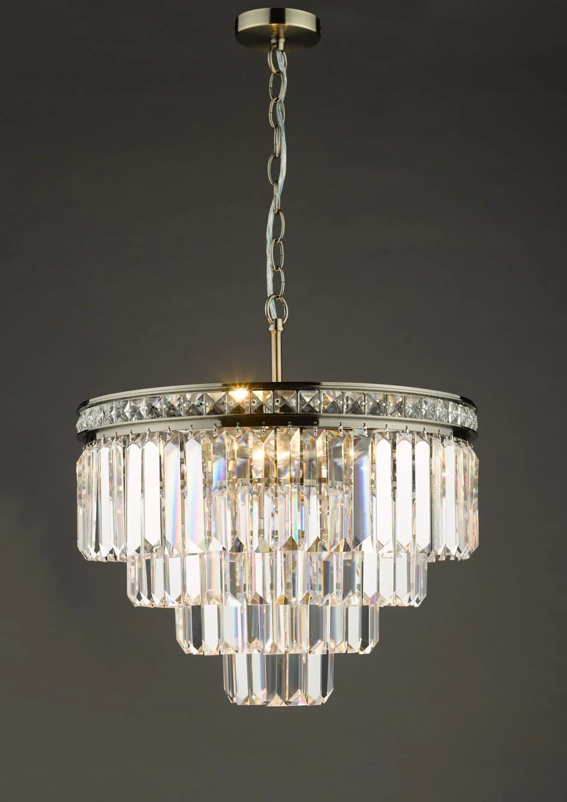 The Vyana is a classic crystal pendant in warm antique brass with faceted crystal squares decorating the frame from which cascade 4 luxury layers of heavy cascading crystal droppers cut in a prism shape. With its high fall, the Vyana statement ceiling light is ideal for use with high ceilings or over tables.