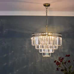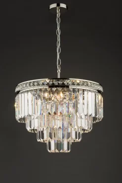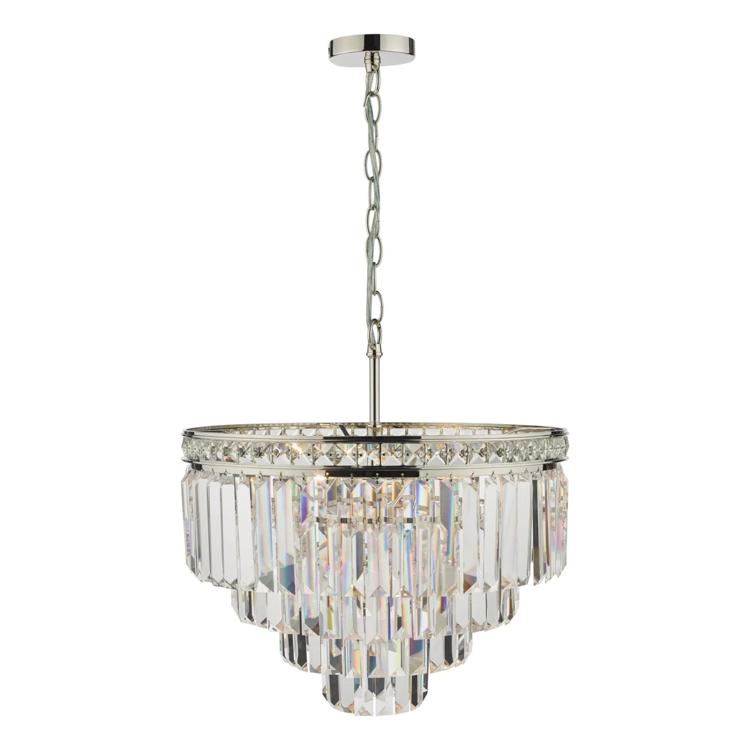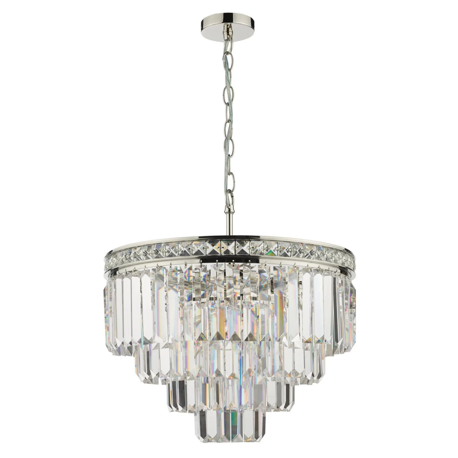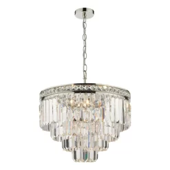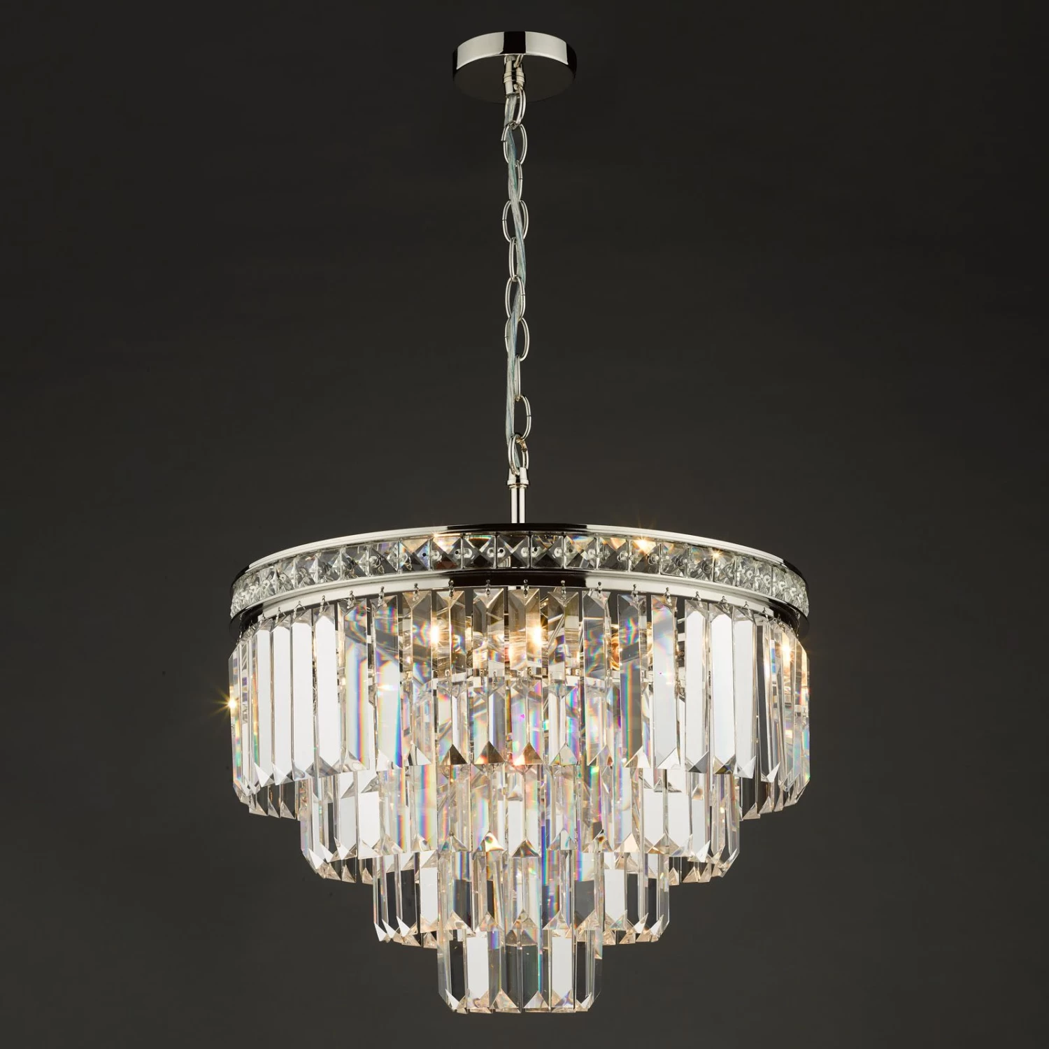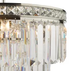 The Vyana is a classic crystal pendant in polished nickel with faceted crystal squares decorating the frame from which cascade 4 luxury layers of heavy cascading crystal droppers cut a prism shape. With its high fall, the Vyana statement ceiling light is ideal for use with high ceilings or over tables.