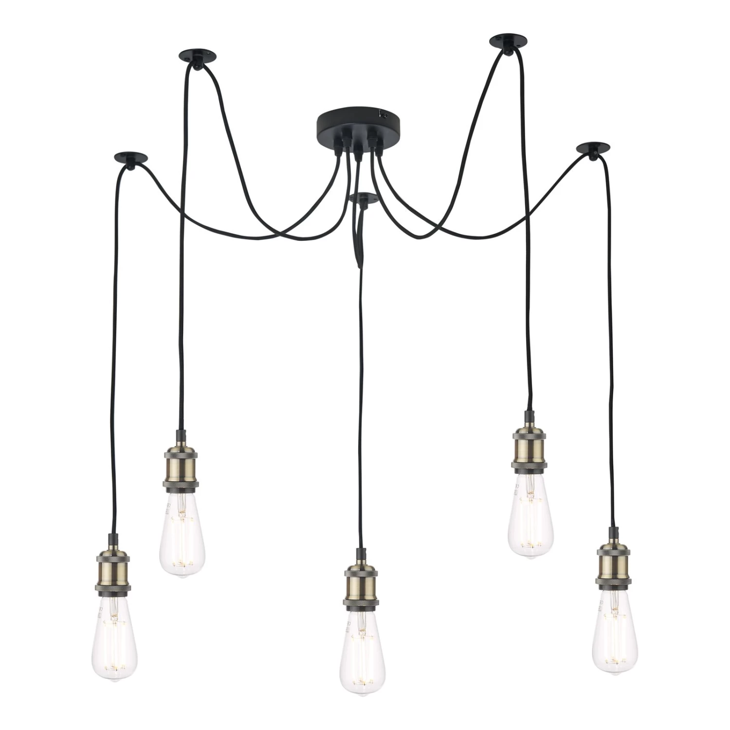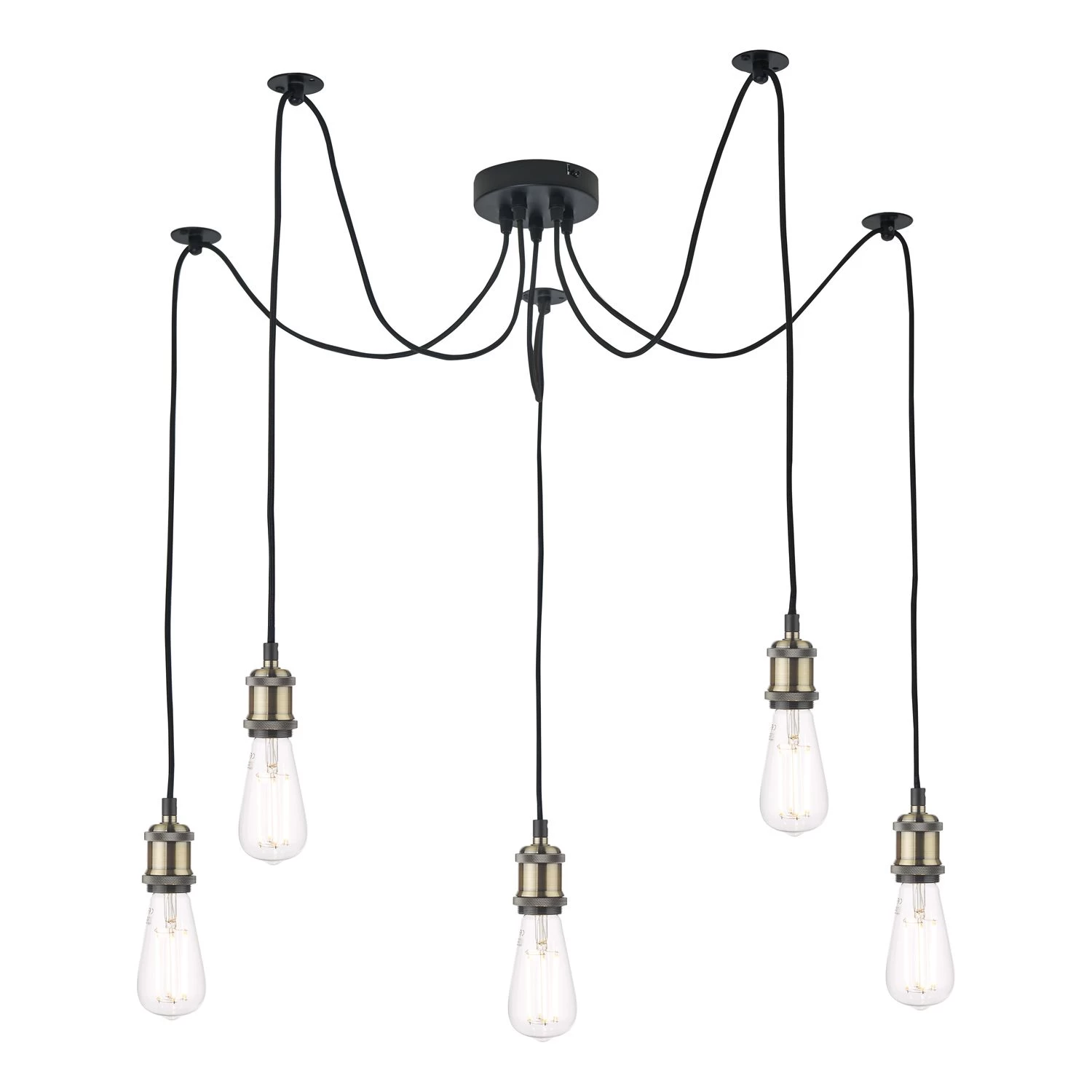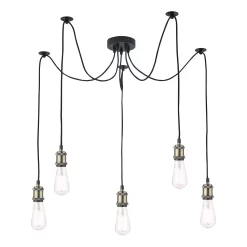 The Waco 5 light pendant suspension features a solid die cast lamp holder in antique brass with a knurled shade ring. With pre-attached metal ceiling hooks on each 1.5m cable the fitting can be adjusted to suit the room or furniture, you can now move the light away from the electric point and have multiple lights on a huge spread without the expense of extra wiring. At the same time the fitting gives a unique industrial look.