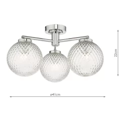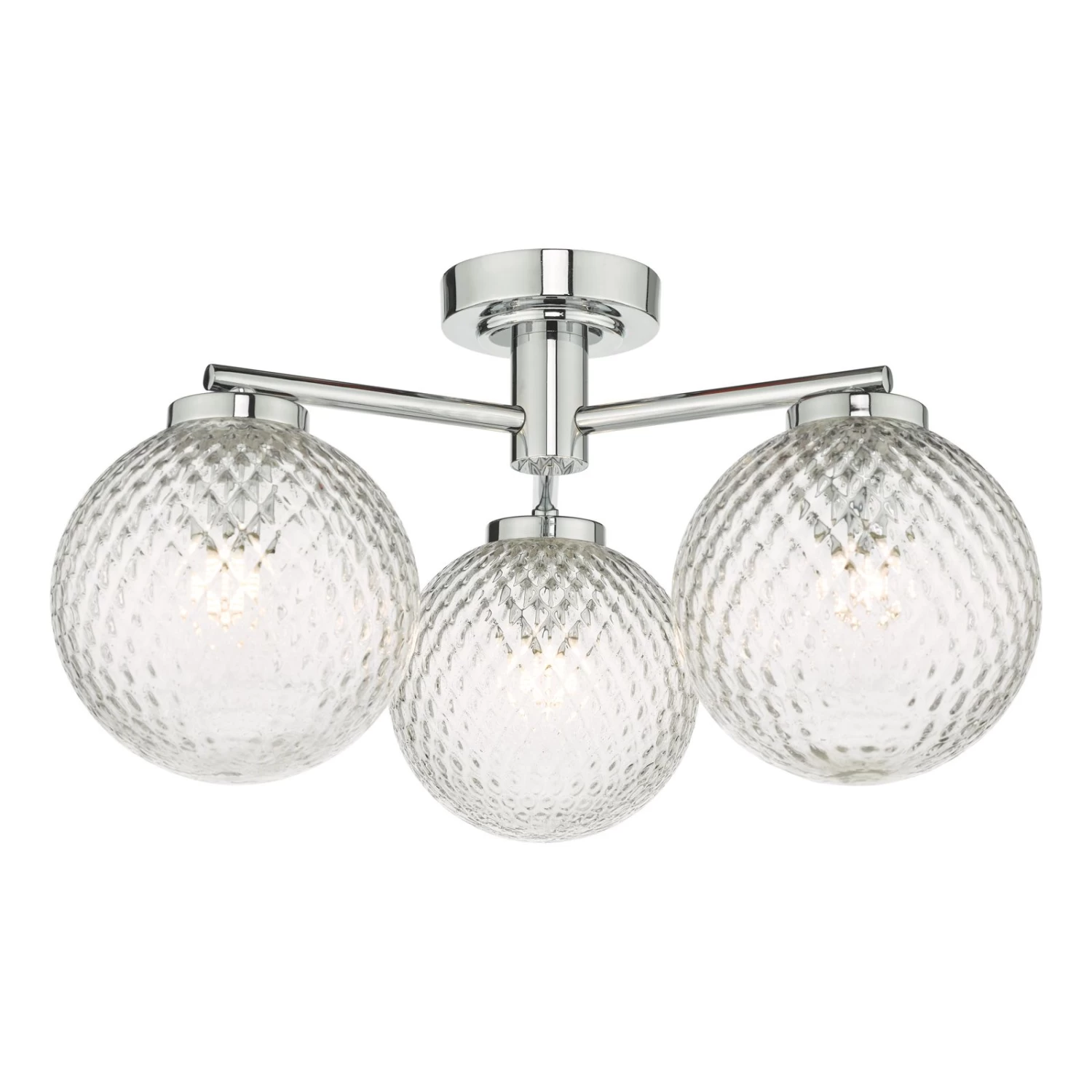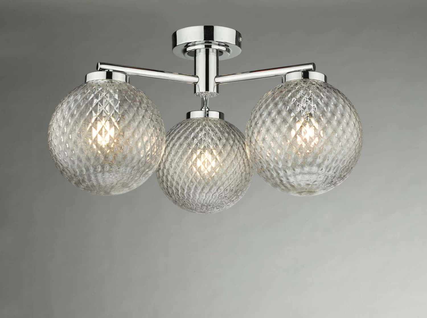 The WAYNE 3 light bathroom semi-flush with textured glass shades and polished chrome metalwork. The textured glass creates a stunning effect when on and looks equally brilliant when off. We find it works best in pairs framing a mirror.