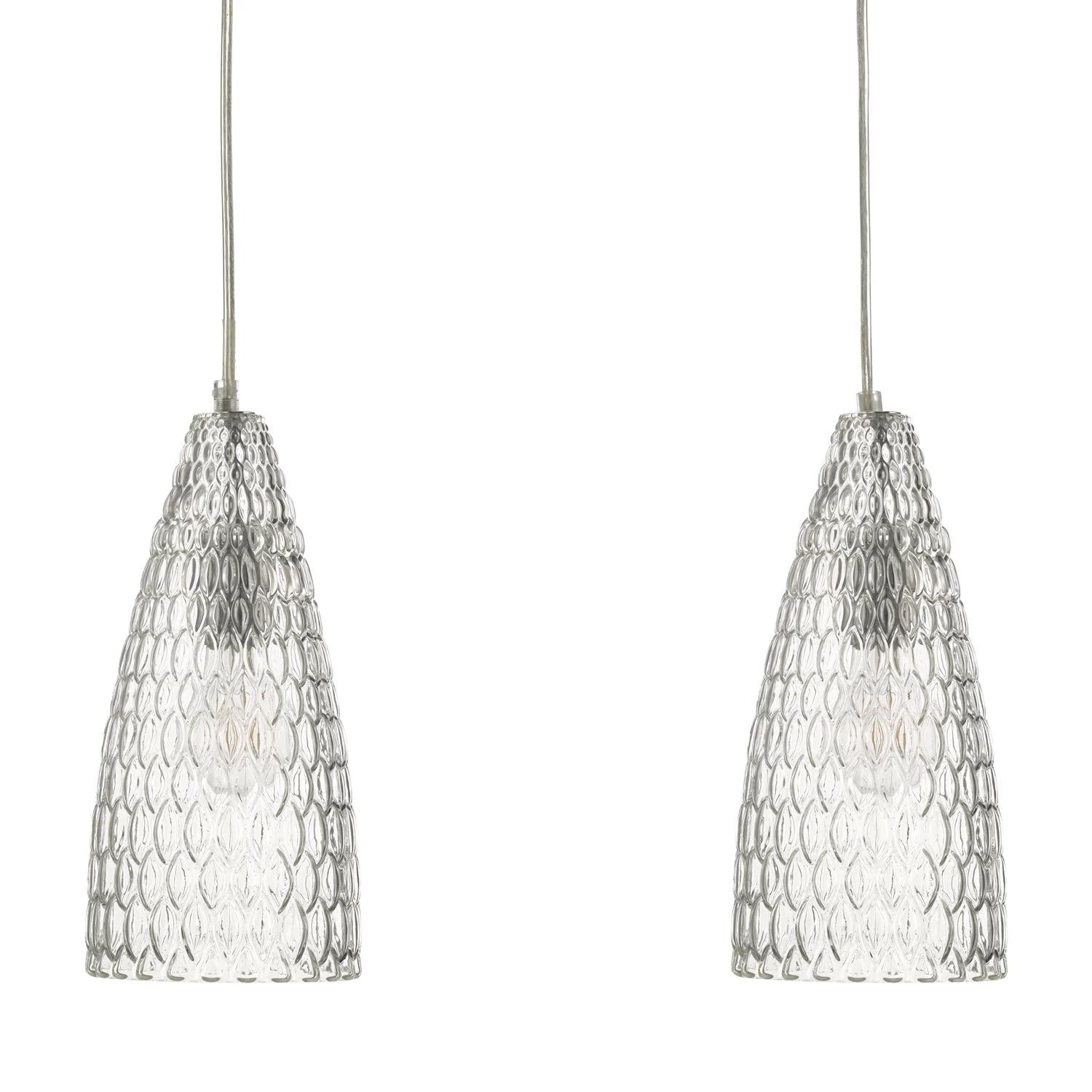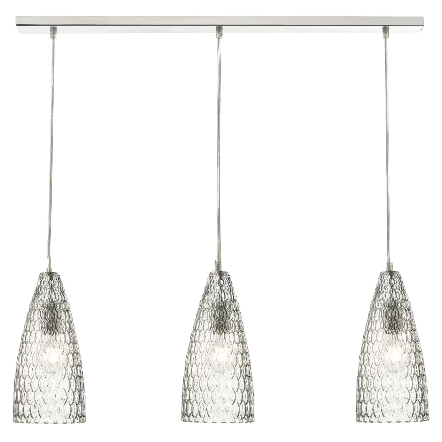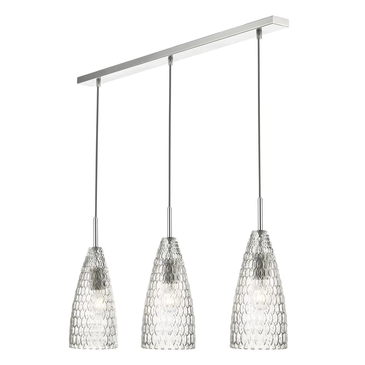 The Zuka 3 light bar pendant features three textured glass shades, complete with polished chrome detailing. Ideal for using above dining tables and kitchen islands. Supplied with a 100cm grey braided cable that’s height adjustable at point of installation.